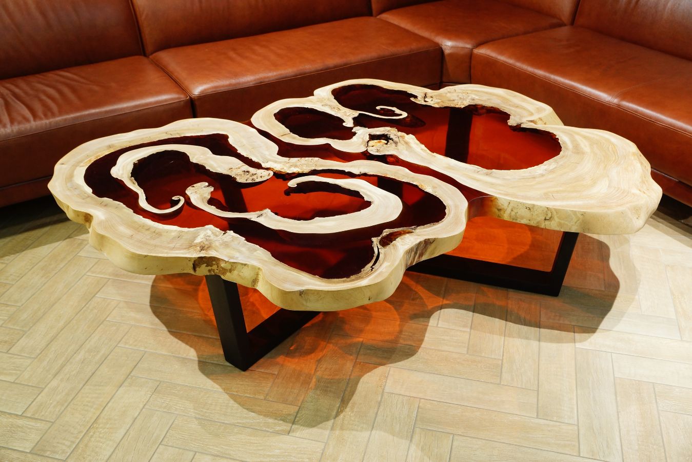 Дизайн офиса разработан и воплощен в лофтовом стиле. Украшением проекта стал индивидуально разработанный стол из уникального по рисунку слэба с заливкой смолой коньячного цвета